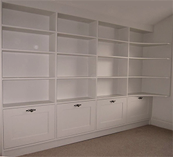 Here, a modern made-to-measure library with storage was required by the client. The result was very smart and elegant addition to the loft room interior spanning the entire wall and corner.