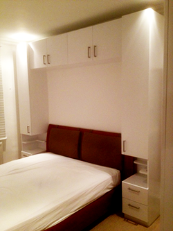 A contemporary suite of bedroom unit made from MDF, spanning the entire wall with concealed storage and bedside cabinets.