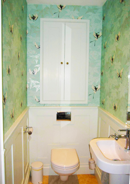 Smart combination of built in storage space in a small toilet. Traditional panelling. Made to an excellent finish.