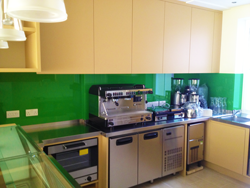 The furniture in this cafe, includes bespoke cupboards made from MDF with sprayed finish. Smartly made to accommodate the coffee shop equipment.